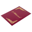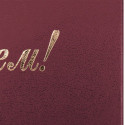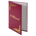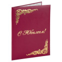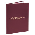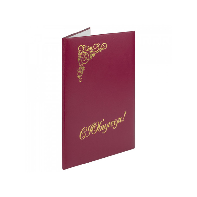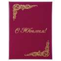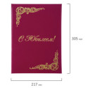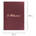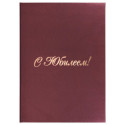 Изготовлена из бумвинила бордового цвета размера 210×297 мм. На обложке есть золотистая надпись «С юбилеем».