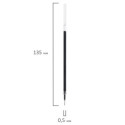 Длина стержня составляет 135 мм. Диаметр пишущего узла 0,5 мм создает тонкую линию письма, равную 0,35 мм. Имеет игольчатый наконечник. Цвет чернил - чёрный.