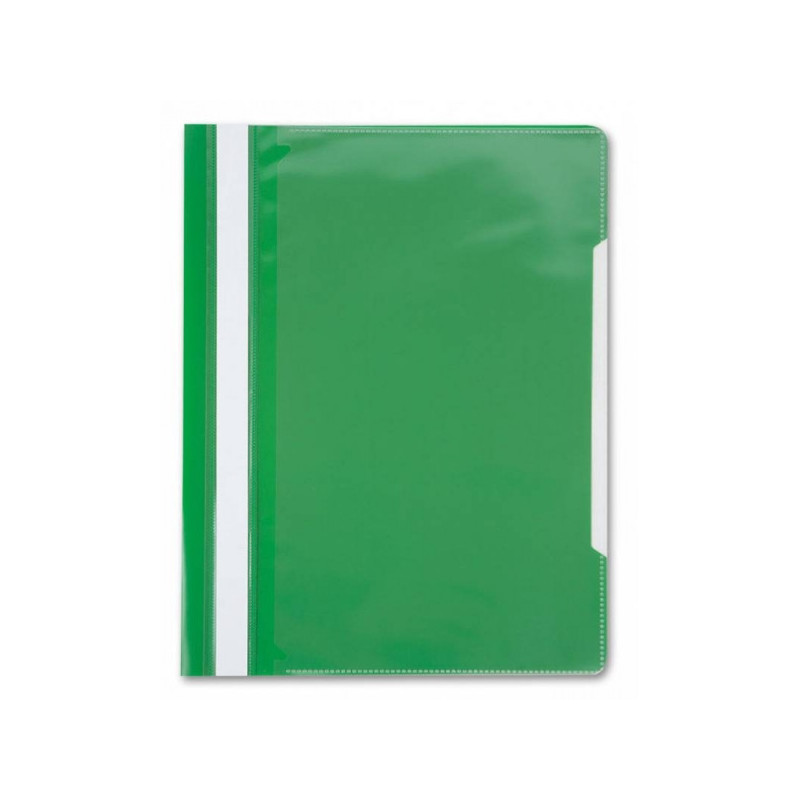 Папка стандартного дизайна выполнена из мягкого пластика. Нижняя часть обложки папки выполнена из непрозрачного пластика зеленого цвета, верхняя часть обложки папки выполнена из прозрачного пластика. Прозрачная часть обложки представляет собой карман для бумаги формата А4. На внешней стороне обложки есть карман со съемной этикеткой, на которую можно наносить надписи.